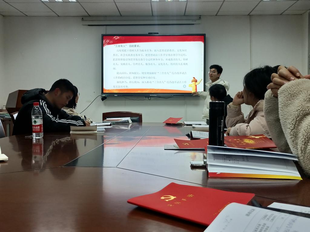 王岩同志在领学《加强和改进“三全育人”工作实施意见》时提到“三全育人”即全员育人、全程育人、全方位育人。他特别分享到召开的12月基层党组织书记例会暨“三全育人”工作推进会的四点要求:一是要落实主责,务实重行;二是要深学真信、力行见效;三是要三全育人、守正创新;四是要全面盘点、系统谋划。