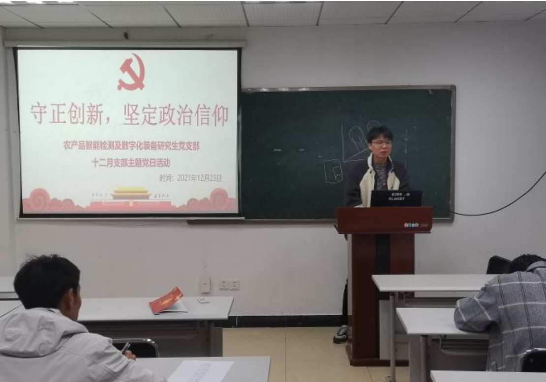 2021年12月23日,为进一步学习贯彻十九届六中全会精神,加强研究生党员思想建设,坚定政治信仰,英国上市公司官网365农产品智能检测及数字化装备研究生党支部在工程楼B620会议室开展以“守正创新,坚定政治信仰”为主题的党日活动。