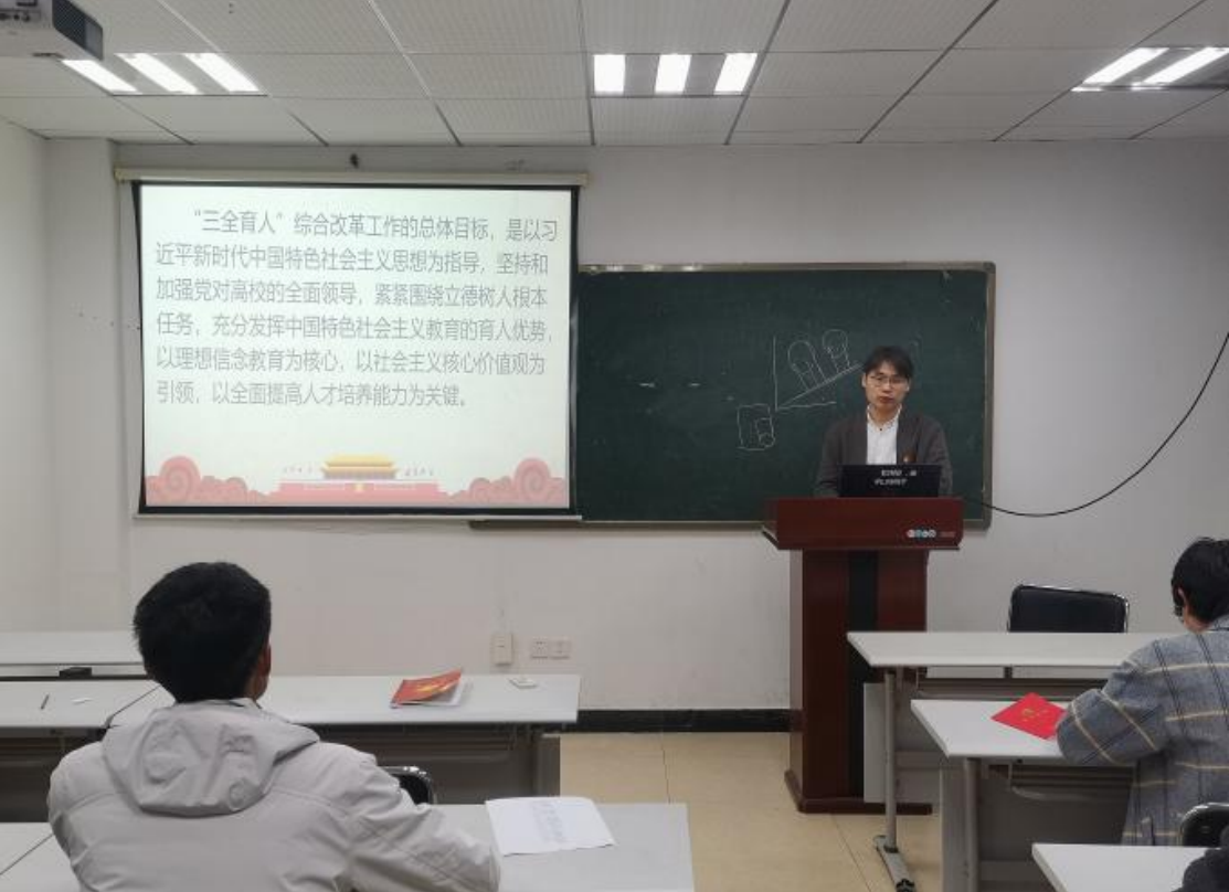 高仁鹏同志领学《加强和改进“三全育人”工作实施意见》时,首先介绍何为“三全育人”以及为什么要实施“三全育人”。他谈到,“三全育人”即实现全员育人、全过程育人、全方位育人。为党育人、为国育才,为中华民族伟大复兴提供强大的人才支撑是高校职责以及前进方向。我们作为研究生党员要以身作则,以习近平新时代中国特色社会主义思想为指导,在日后的学习生活中树立不断奋斗、不怕困难的坚定信念,发挥模范带头作用。