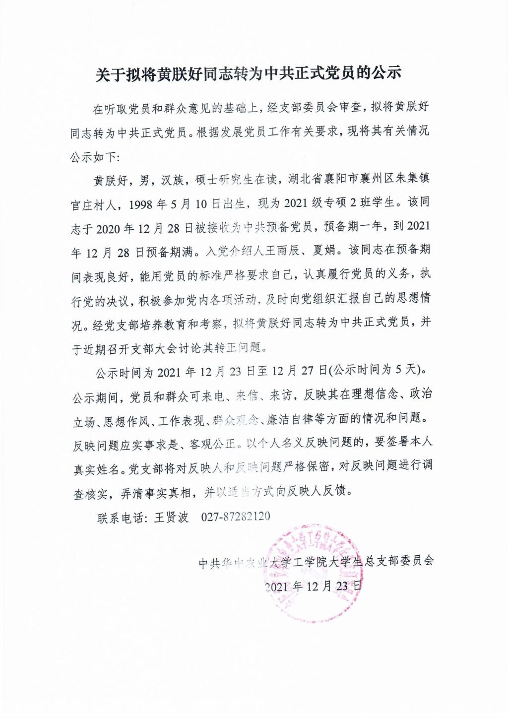 【研】关于拟将黄朕好同志转为中共正式党员的公示