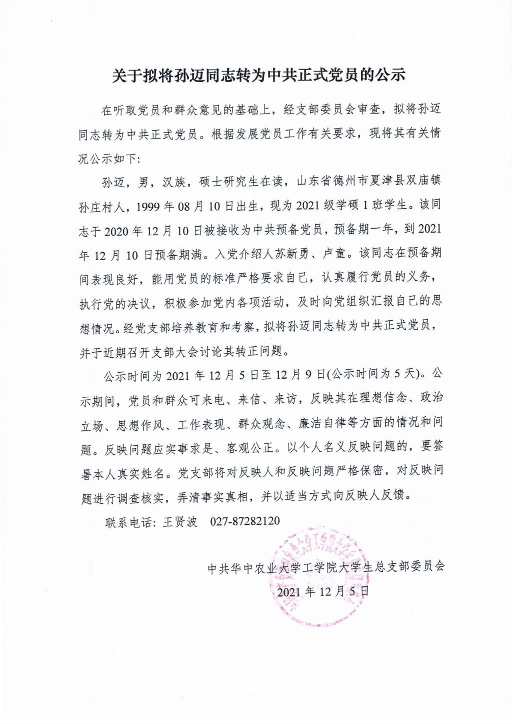 【研】关于拟将孙迈同志转为中共正式党员的公示