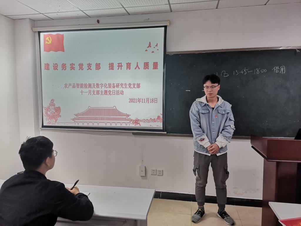 2021年11月18日,为加强思想建设,学习贯彻党的十九届六中全会精神,英国上市公司官网365农产品智能检测及数字化装备研究生党支部在工程楼B620会议室开展“建设务实党支部,提升育人质量”主题党日活动。