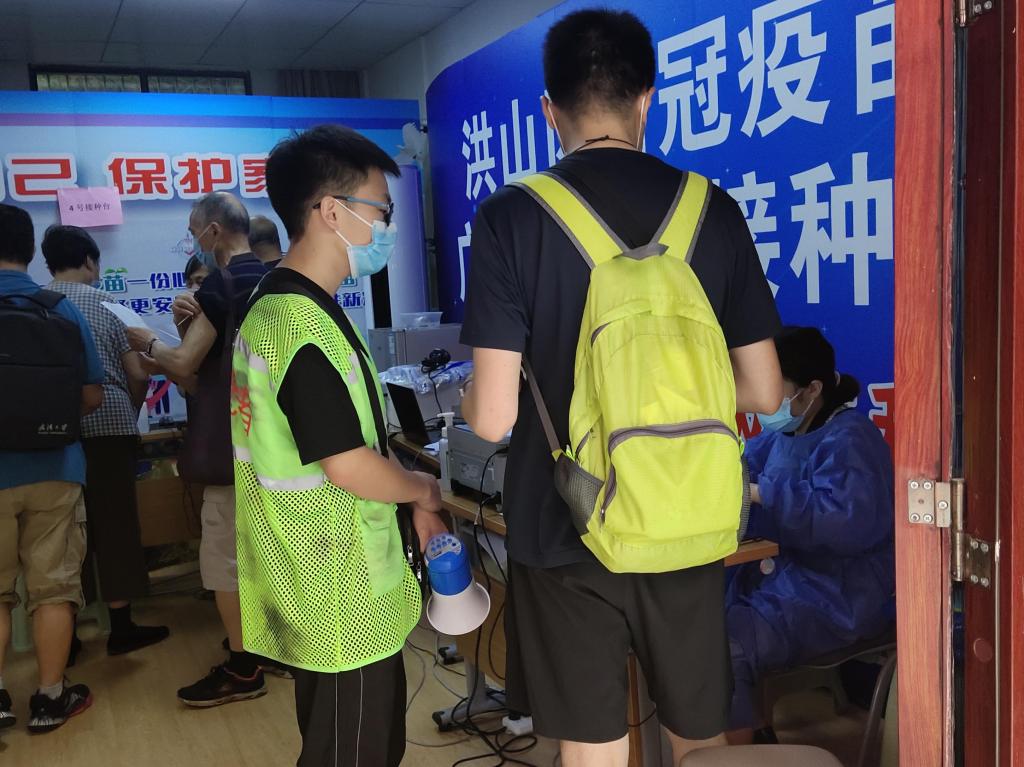 “建立档案、签写知情书、核验条形码、登记接种信息、引导留观、告知注意事项、分发接种证明”接种现场,志愿者们认真做好疫苗接种的每一个细小环节,在正午三十多度的烈阳下,志愿者们挥汗如雨,他们声音哑了、腿站疼了,但毫无怨言。实践团成员黄燕同学说:“能够参与疫情防控,助力疫苗接种,我觉得非常有意义。作为一名新时代青年,我们有责任、有义务发挥自己的光热,为构建全民免疫屏障作出自己贡献。