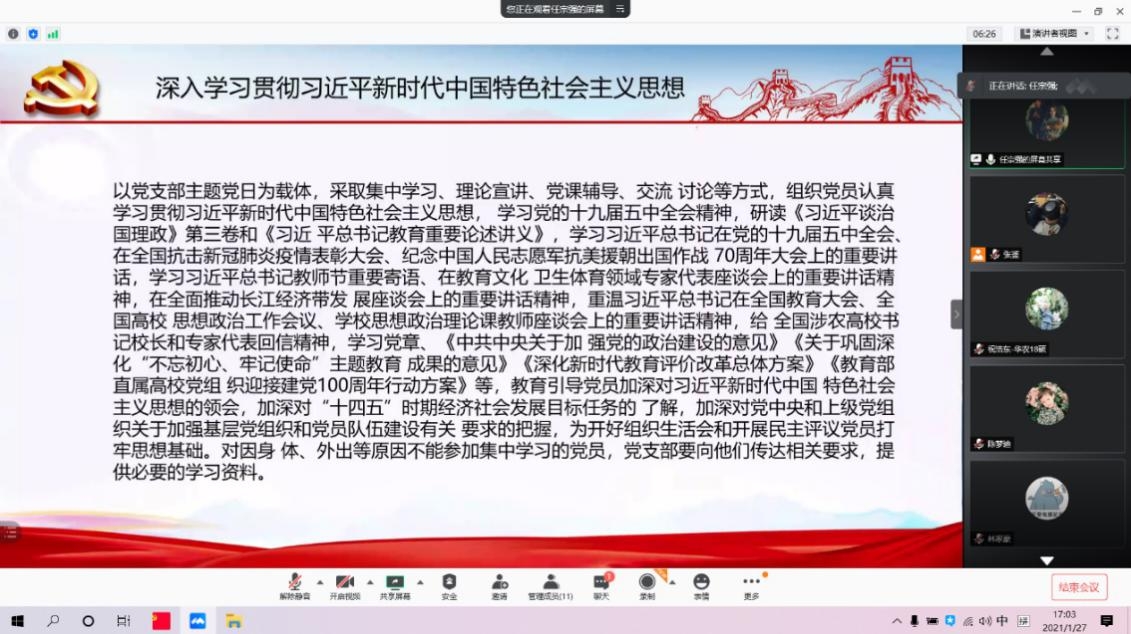 支部书记张帅同志会后总结到,这次主题党日是线上线下同步进行的,寒假期间的类似活动将采用线上会议的方式进行,希望各位党员同志积极配合,加强沟通,保证组织生活高质量有序开展。