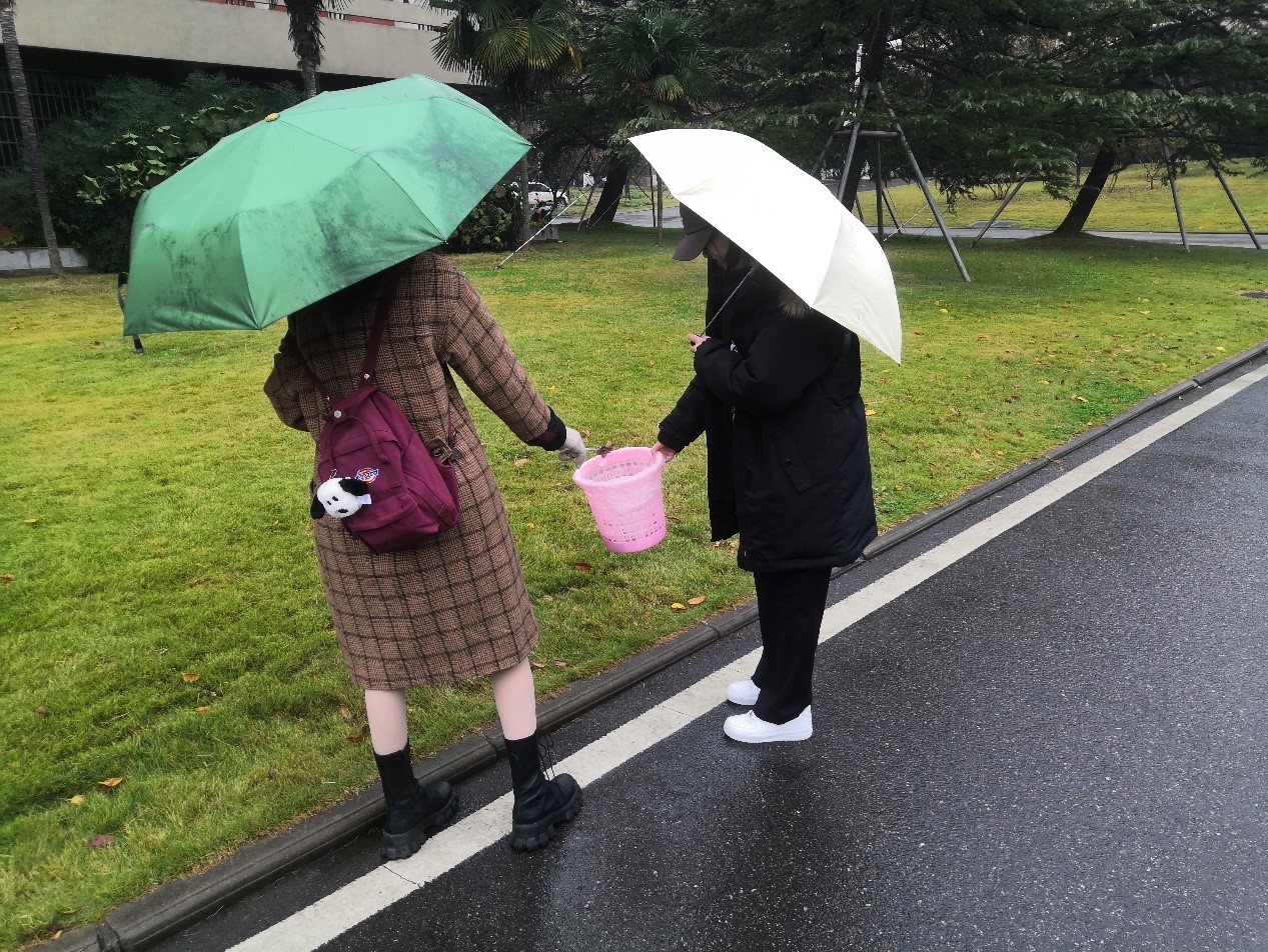 活动进行过程中下起了小雨,但同志们的工作热情丝毫未减,为确保志愿活动的顺利进行,同志们两人一组,一人撑伞一人捡拾垃圾,既保证了工作质量,还促进了同志间的相互交流。大家相互配合,狮子山广场到处都是同志们忙碌的身影,一个个“低头族”仔细地寻找着地面上和灌丛中的垃圾。