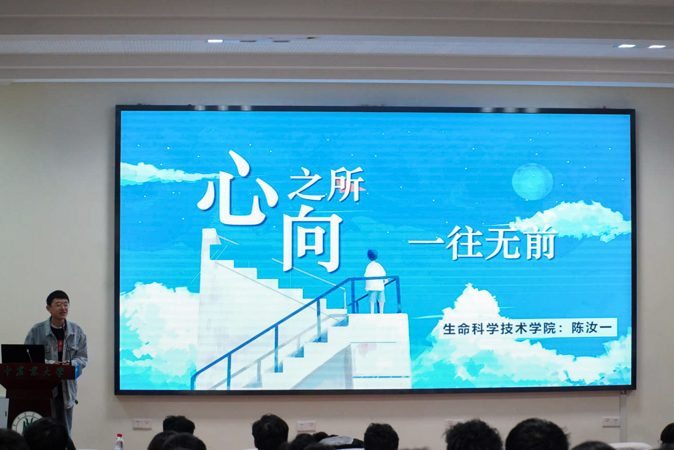 “拼一切努力,奔无悔前程。”来自生命科学技术学院的陈汝一展示了自己大学前期与后期的成绩对比,从单科倒数再到班级第一的经历证明了 “世上无难事,只要肯攀登”。做好时间规划,自我管理,是陈汝一获得成功的重要法宝。在进入课题组的他把握自己每一分课余时间,在提高专业课成绩的同时扩充课题知识,为了坐在第一排听课,陈汝一每天早上5:30起床完成自己项目工作后再赶去上操,日复一日。功夫不负有心人,选择远方的陈汝一在风雨兼程中提升自我,一往无前。谈起自己如何在学业压力中放松,陈汝一用自己与敬老院双目失明的马奶奶以一个烤红薯结缘的故事,用自己在敬老院与盲校陪伴、乡村支教、抗疫坚守的事例,如数家珍地向大家讲述了“付出使我快乐”的志愿服务经历。在分享的最后,陈汝一结合自己的经历,激励大家:“如果不知道距离目标有多远,不妨多努力一点,在结果出来之前,不如在拼一次,因为努力和拼搏才是一个大学生最美的样子!”