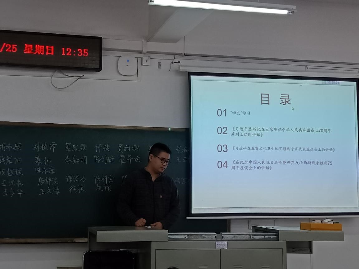 陈永康同志带领大家学习了《习近平总书记在出席庆祝中华人民共和国成立70周年系列活动时讲话》、《习近平在教育文化卫生体育领域专家代表座谈会上的讲话》、《在纪念中国人民抗日战争暨世界反法西斯战争胜利75周年座谈会上的讲话》重要精神。陈永康同志提到,新中国70年来披荆斩棘、筚路蓝缕的壮阔历程,彰显了中国人民百折不挠 、团结拼搏的奋进精神,宣示了中国坚定不移走和平发展道路、推进构建人类命运共同体的坚定决心。同时,陈永康同志以抗日战争胜利的四个伟大意义为切入点,号召支部同志学习先辈“天下兴亡,匹夫有责”的爱国精神,增强主人翁意识,勇担民族复兴的时代大任。