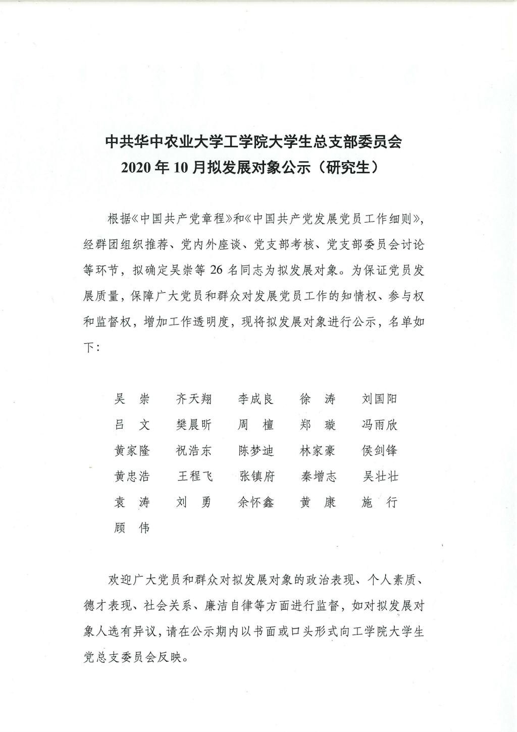 中共英国上市公司官网365大学生总支部委员会2020年10月拟发展对象公示(研究生)