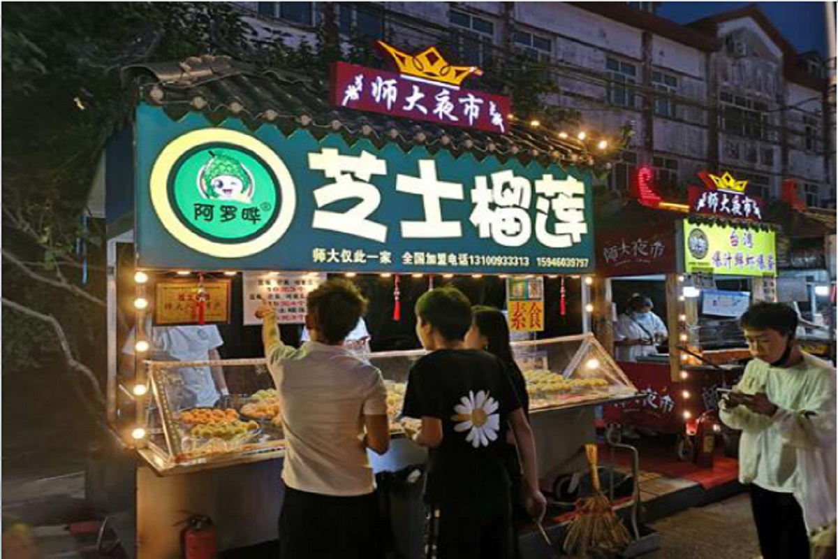 在进行调研观察时,可以很明显的发现在师大夜市,每一位摊主的摊位上都摆放有业户公示板,上面有摊主的健康证与各种许可证明,食品与人群之间都有防护罩和塑料膜来防止污染,在每一位摊主摊位的下方均配有灭火器,垃圾桶,扫帚等清扫工具。摊主们说,这是监管部门进行要求的,这样的规定使得夜市的环境卫生得以保障,即使有几百家的小吃摊,街道上仍然干净整洁。不仅如此,其他被采访的摊主也表示,除了环境卫生外,在疫情好转重新开张后,监管部门还对摊主们的进货渠道与相关食用油进行了审查,在食品安全方面加大了保障。在采访过程中一位摆摊4年的摊主,令人印象深刻。她所售卖的产品是经过自己研发的,四年的时间里她不断地进行产品改革,如今售卖的正是第四代甜品,相比于之前的产品,更能受到年轻人的欢迎。在这期间,她也成功注册了属于自己的商标。她的努力为她带来了很多收益,因此她坚持摆摊。