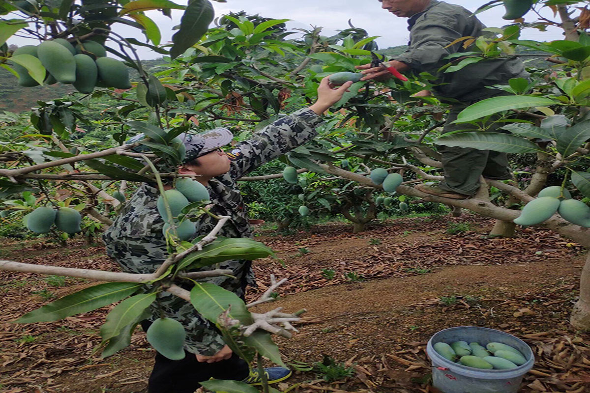 8月11日,实践团成员中来自广西北海的黄俊才对当地的灵山果园进行调查帮工。询问得知,工人大都是附近的农民,农闲时过来帮忙。虽然今年因疫情几个月不能工作,但疫情过后幸福感逐渐升高。与此同时来自广西百色的黄鑫的家乡正值芒果丰收,他来到了果山上帮助采摘芒果,帮助果农把剪切下来的芒果进行恰当的安放,并且将其通过传送装置运下山下。在和果农交谈时,黄鑫同学利用了自己的专业知识帮助回答了果农关于如何改进运输装置的一些问题。