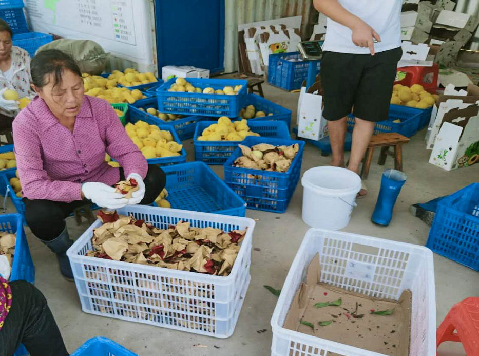 八月初走进玉屏侗族自治县前光村的黄桃基地,一眼望去,绿油油的桃树上已是硕果累累,村民们有的在基地收割黄桃,有的在把黄桃按重量称重,有的在把黄桃套袋装盒。基地负责人介绍:“我们黄桃基地施的都是农家肥,不打农药、除草剂,着力打造无公害、绿色果园。”姚青与负责人交谈了解到,前光村出产的黄桃果大、肉厚、口感脆甜、营养丰富,远销上海、江浙、广东一带,并得到了他们的高度认可,并且前光村一共种植了两百余亩的黄桃,今年预计量产可达十公斤,产值一百万元左右。