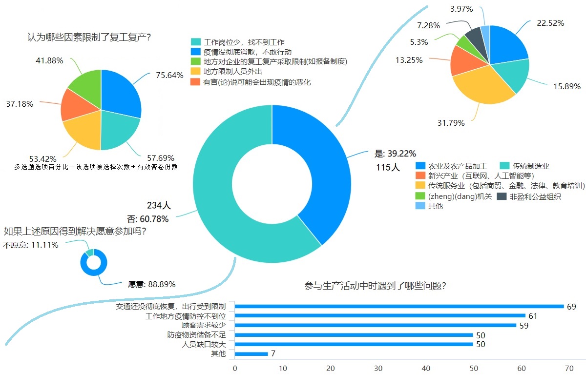 在调查中,发现有40%的人参与到了生产活动中去,并且这115人中有31%的人从事于传统服务业,22%的人从事了农业及农产品加工,他们表示在参与生产活动中普遍遇到交通受限、疫情防控不到位、顾客需求较少等问题;另外还有60%的人没有参与复工复产活动,大多是因为疫情没彻底消散不敢行动、找不到工作、地方限制人员外出等问题,而其中有90%的人表示,如果这些问题得到解决,他们将会积极参与。