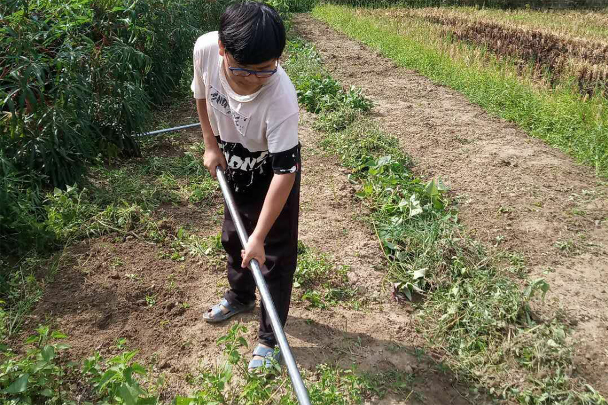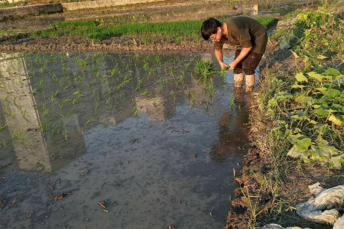 陆森昌首先进行的是除草挖坑工作。除草能有效避免杂草与作物争夺营养,提高作物产量质量。挖坑是为后续插禾做准备。除草挖坑这项工作看起来简单,但其实也大有门道。在实践过程中,陆森昌总结出了一些经验:除草需要从地头开始,这样就可以避免杂草砌堆,避免有些地方无法除到;挖坑要目测好距离,避免过密或过疏。除草河挖坑虽然很累,但想到几个月后就能收获成功的农作物,陆森昌感觉累也值得。