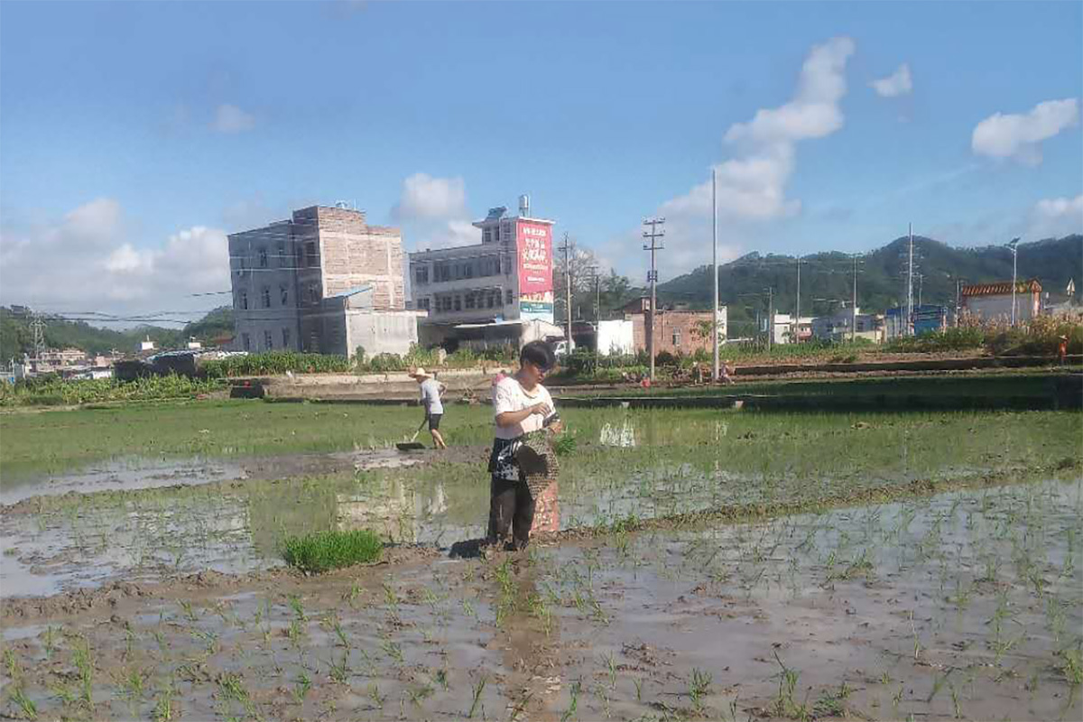 8月3日正午,陆森昌仍在烈日下挥汗插禾。在此次实践活动中,陆森昌体会到了田间劳作的辛苦,强健了体魄,更了解到了粮食作物的来之不易,对食物更加珍惜。