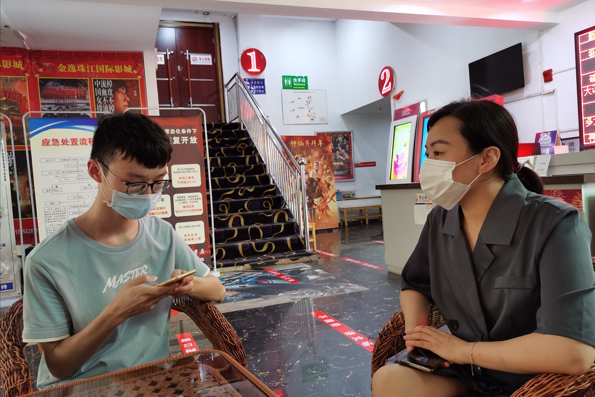 团队成员高唯漪和覃笑阳来到了湖北省宜昌市的丁金逸珠江国际影城开展实践活动。访谈进行过程中,工作人员积极配合并给出了许多有用的信息。工作人员告诉覃笑阳和高唯漪,如今电影院人流量比往年淡季还要少,每天仅有几十人次。另外,在排片量减半的情况下,一些市民们期待的电影无法如期上映,这也是客流量减少的原因之一。然而,尽管客流量大不如从前,如今电影院的工作量却比疫情前更加繁重,不仅要对入场的客人进行登记和测温工作,还要在放映前后对片场进行消毒。同时由于疫情的影响,现阶段不允许影院售卖爆米花等小食,这也在一定程度上影响了影院的收入。