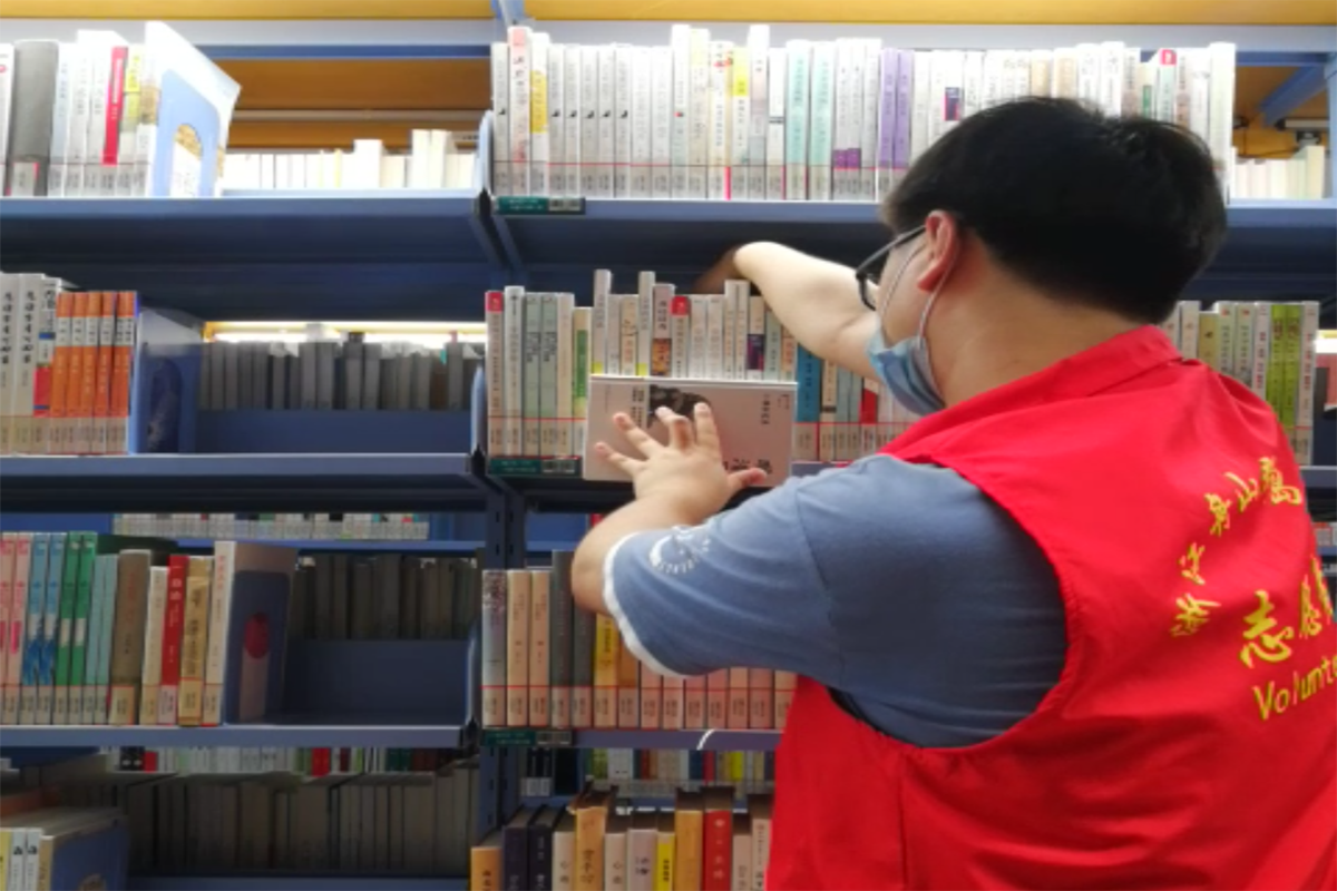 下午14:00,将整理完的书籍放入消毒设备中,进行长达50分钟的消毒,保障图书馆的卫生安全,为市民提供安全的借阅环境。一个小时之后,书籍的消毒工作已基本完成,接下来需要将其进行分类上架。傅佳翌及其他志愿者根据早上的培训,将书籍按照书籍大类、分属小类、作家号、书籍册号依次进行分类排布,再下放到各个管理区进行书籍上架工作与差错工作,对已放好的书籍进行排查,查找是否有书籍被借阅者随意防置在其他书架上。
