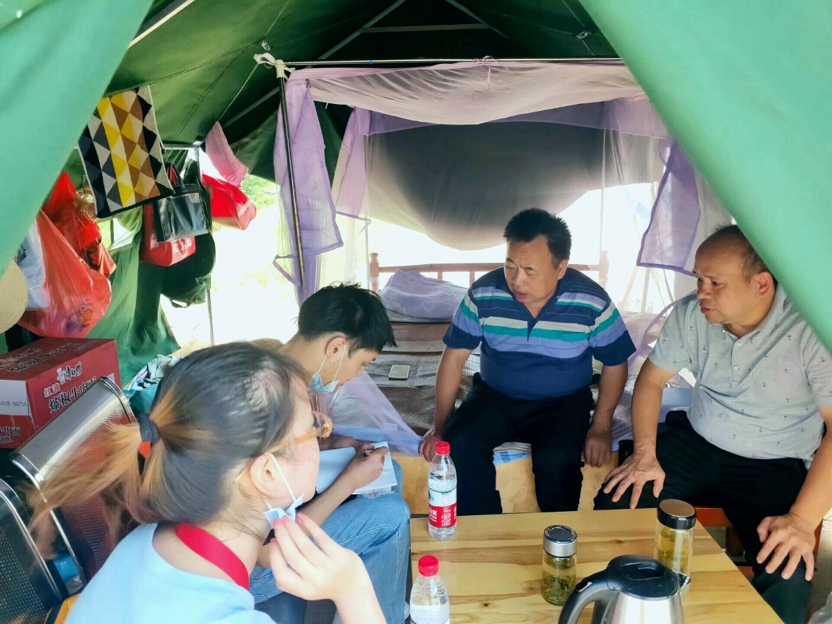 孝南区境内湖泊众多,主要支流有澴河、府河等。团队成员的第一站是八一大桥,八一大桥建于府河之上,对于孝感南北向的交通发挥了至关重要的作用。汛期之前的大桥下,河岸的绿植郁郁葱葱,现如今在强降雨的侵袭下,河岸附近的一些小树被水淹没,仅能看见树尖。为了对防控状况进行更深入的了解,团队一行人拜访了东山头堤防的防汛抗洪突击队。突击队驻扎地由几个简陋的棚子搭建而成,内部设有几方桌椅,在此成员们采访了几位驻堤干部与热心村民,了解到汛情相关情况:2016年八一大桥曾发生过决堤。在正常情况下大桥水位为23到24米,而2016年最高水位已达30.5米,洪水漫出堤坝以致决堤。此后政府大力修善加宽堤坝,主要干道府河堤坝提高到30.5米,今年府河最高水位已达29.89米。