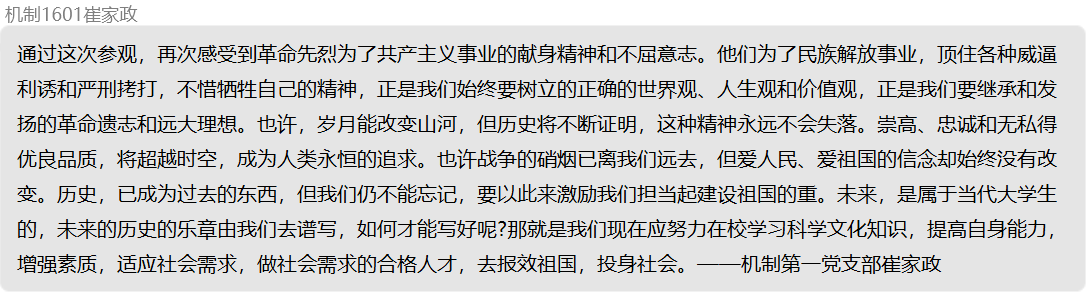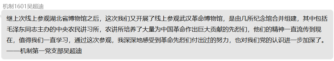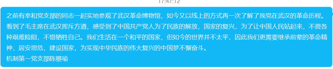参观结束后,大家纷纷在群里发表自己的参观感想。王立恒同志表示,随着时间的流逝,我们的党在不断进步,我们也在不断进步,要从党的历史中了解到我们今天幸福生活的来之不易。崔家政同志表示,先人不惜牺牲自己的精神,正是我们始终要树立的正确的世界观、人生观和价值观,正是我们要继承和发扬的革命遗志和远大理想。此外,还有许多同志都表示此次线上参观让自己对那个硝烟弥漫的年代有了更多更深的了解,也让自己感受到了时代的巨大变化。