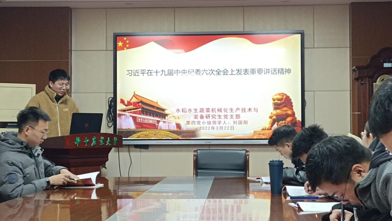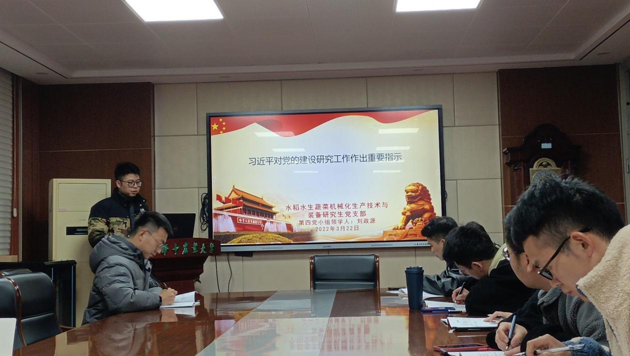 2022年3月22日,水稻水生蔬菜机械化生产技术与装备研究生党支部在工程楼A201开展3月份“深化政治理论学习,强化政治引领”主题党日活动。