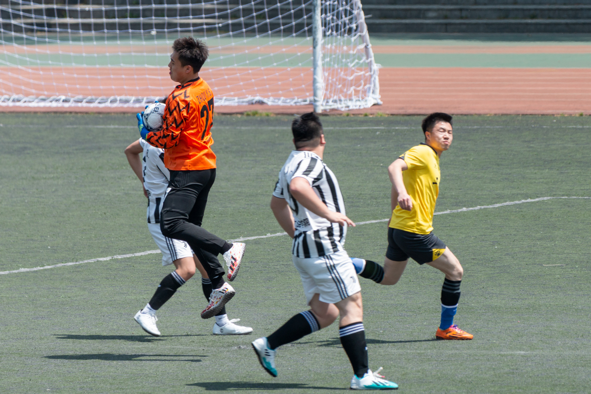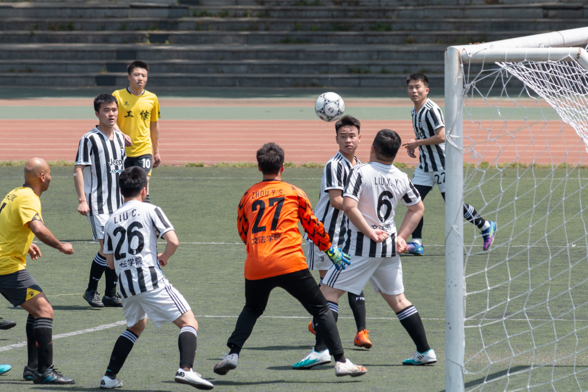 比赛开始后,双方你来我往,积极抢球防守,逐步进入比赛状态。第15分钟,工信联队29号李宇恒将角球发至禁区,双方球员积极拼抢,足球在混乱中打到对方球员身上弹进了球门,1:0,工信联队暂时领先。第36分钟,文法学院队9号赵昊抓住机会反攻、突破射门,但工信联队99号尚昱君准确判断,轻松防守。随着时间推移,双方球员互有攻势。随着中场哨响,上半场比赛工信联队1:0领先文法学院队。
