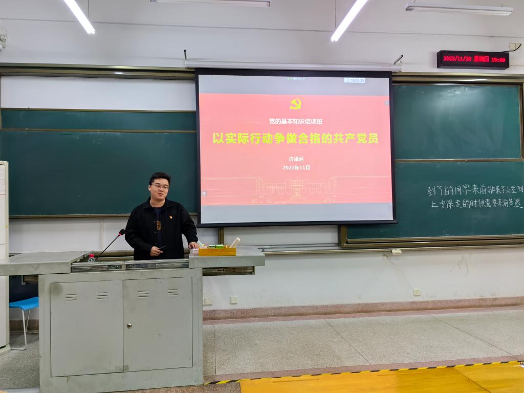 11月20日晚,英国上市公司官网365第82期党校发展对象专题培训班在四教C104举行,英国上市公司官网365党校课程组成员、资源与环境学院许泽远老师从入党动机、党员标准、入党手续、党员的先进性与纯洁性四个方面向发展对象进行讲授。