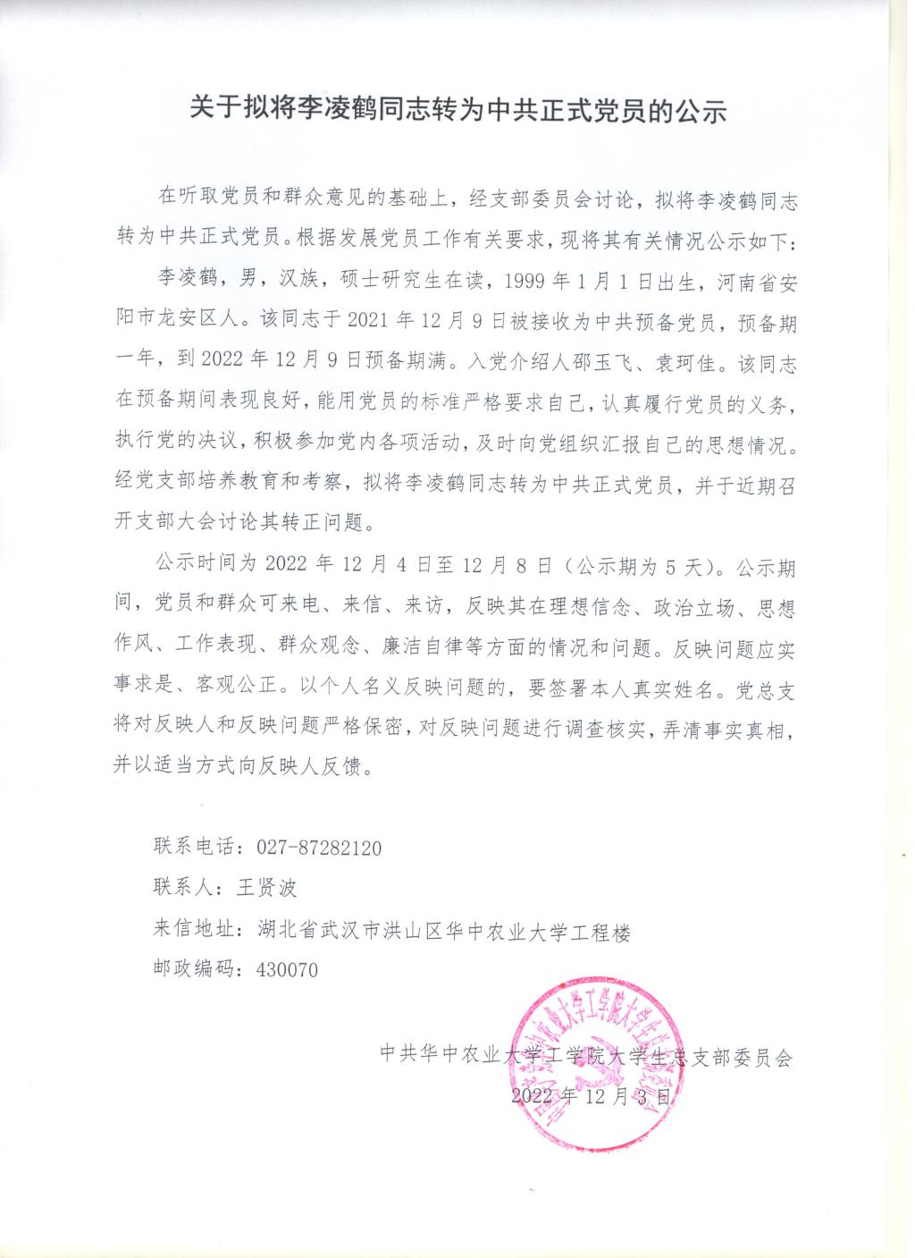 【研】关于拟将李凌鹤同志转为中共正式党员的公示