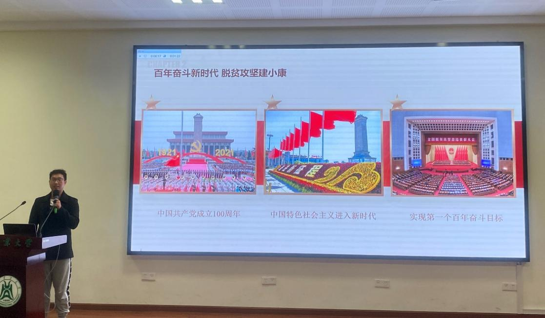 “百余年前,一艘南湖上的红船从黎明中驶来,中国革命放射出第一缕绚丽的曙光,从此有了正确的航向。”油菜机械化生产技术与装备研究生第一党支部的张子龙讲述了中国共产党百年奋斗的光辉历程,在中国共产党的领导下,一代又一代优秀青年牢记初心使命,勇立时代潮头,为民族解放和国家富强建立了不朽功勋。“‘奋斗’二字写在每一代中国青年的基因里,时代的考题已经列出,我们要永远跟党走,奋进新征程,交出让人民满意的答卷。”