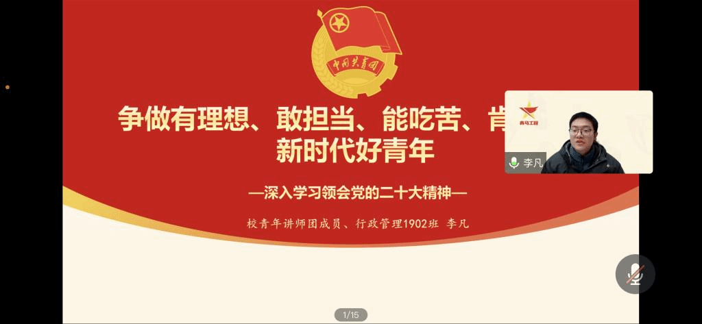 为深入学习贯彻党的二十大精神,引导青年学生坚定理想信念,12月14日晚,英国上市公司官网365开展主题为“争做有理想、敢担当、能吃苦、肯奋斗的新时代好青年”的线上宣讲活动。本次活动面向本科生机械四个团支部,邀请到来自公共管理学院的校二十大精神青年讲师团成员李凡同学进行分享交流,会议由本科生辅导员李龙程主持。