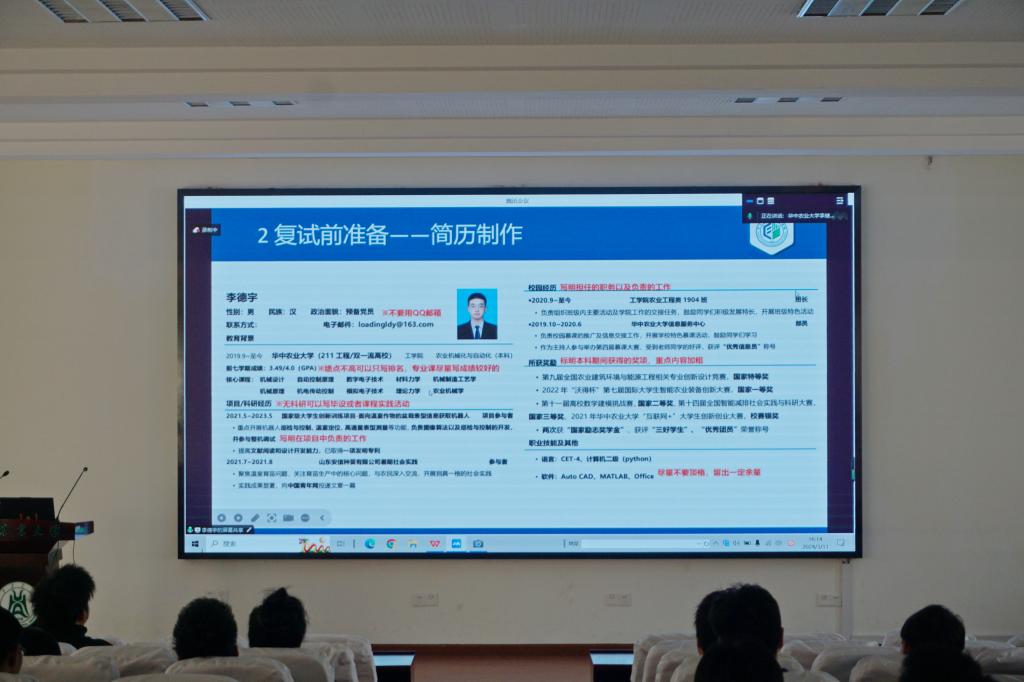 分享会上,考研至中国农业大学的李德宇首先以线上形式进行了分享。他强调了初试成绩公布后尽早联系导师的重要性,并详细讲解了如何准备简历和自荐信。他提醒同学们在联系导师时,要充分了解导师的研究方向和成果与自己的科研兴趣的匹配度。同时,他对复试过程中的面试着装、英语面试流程及注意事项做了介绍。
